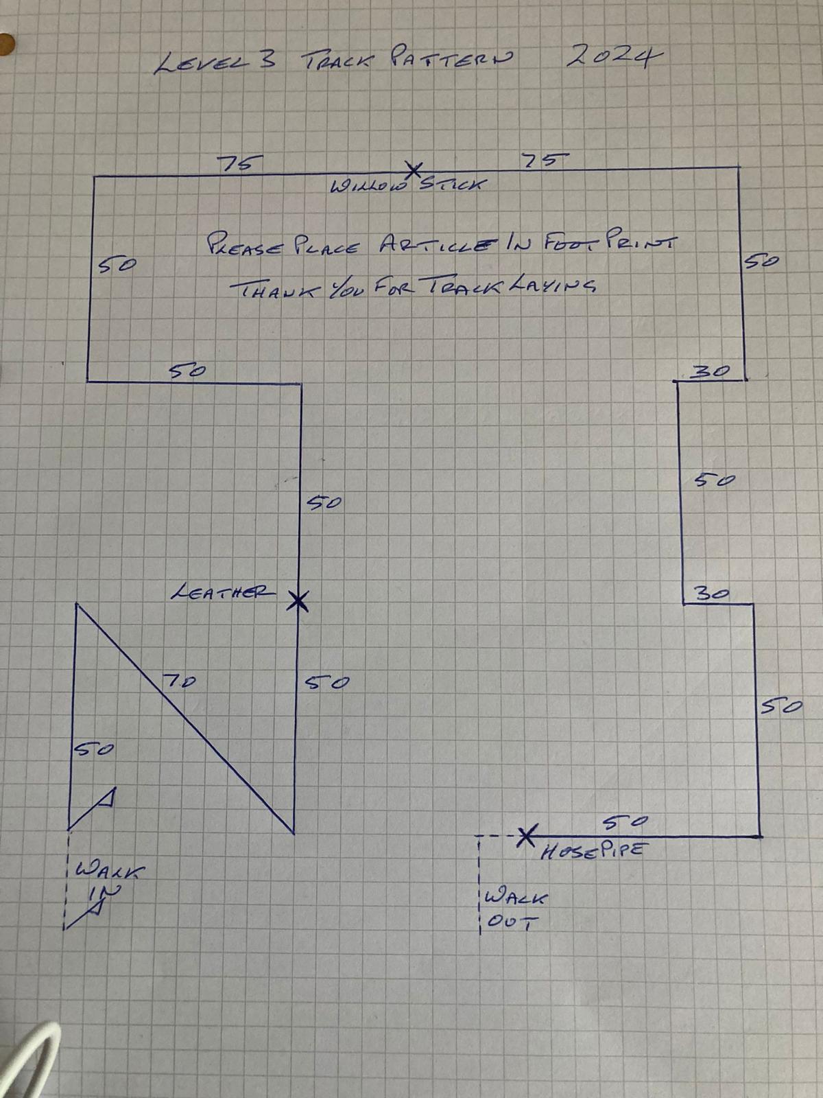 None of these failures had anything to do with the judge or the tracklayers as they all did a great job. Heather Donnelly did the judging and set straightforward patterns (see below) and Pip Nason laid the 3 Level Two tracks and Andy Baker the 2 Level Three ones. Big thank you to you all for all your efforts and for being such good company.